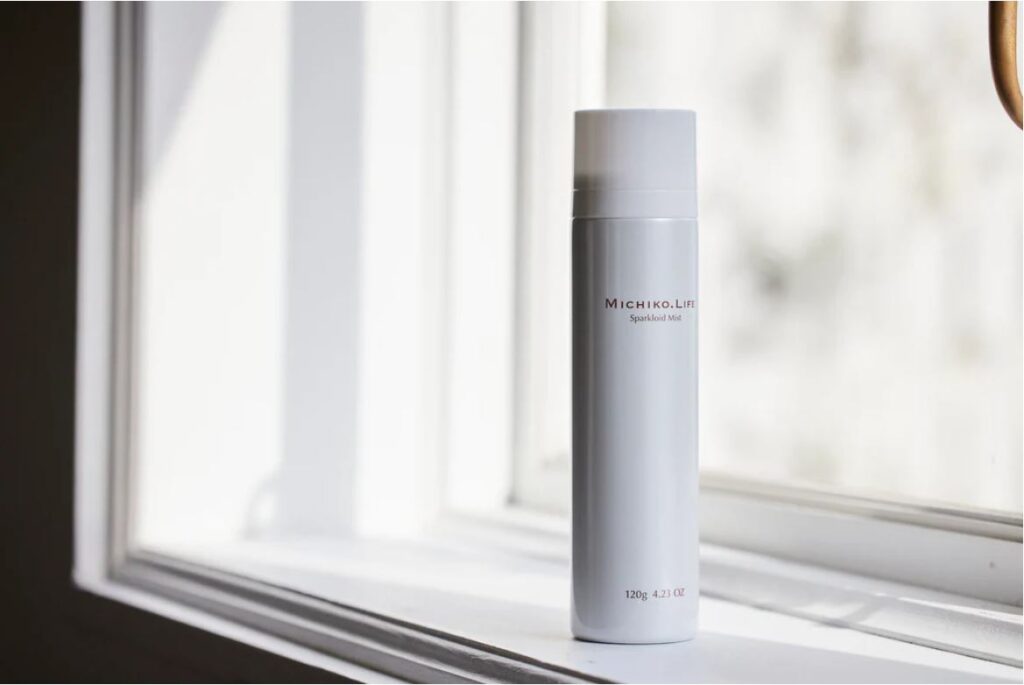 こまめな保湿と同時に大事なのが、アイテム選び。水分だけのフェイスミストは肌本来の水分も奪ってしまう可能性があると言われているけれど、MICHIKO.LIFEの「スパークロイドミスト」は美容成分を配合した高保湿炭酸※ミストローションなので大丈夫。ベトつかないのにしっかり潤って、手にとって塗り広げる必要もないので日中も手軽に使えます。